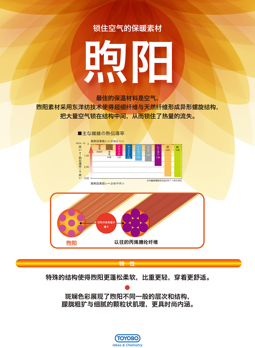 最佳的保溫材料是空氣,煦陽(yáng)素材采用東洋紡技術(shù)使得超細(xì)纖維與天然纖維形成異形螺旋結(jié)構(gòu),把大量空氣鎖在結(jié)構(gòu)中間,從而鎖住了熱量的流失。